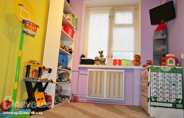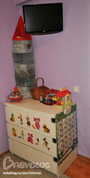 обернувшись назад, видим белый комод. куплен он был еще к рождению сына и когда-то на нем лежала доска для пеленания. сейчас в нем лежит часть Костиной одежды, а точнее нижнее белье. ну а сверху игрухи (без них никуда). ну и конечно Костина говорящая азбука. с помощью неё он к 2.5 знал все буквы, когда стоял около неё (и только около неё), нажимал на буквы и какал. сверху мягкие полочки (икея) и телевизор.