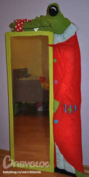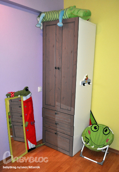напротив кровати стоит шкаф для одежды (как вы догадались, он тоже из икеи), зеркало, Костина любимая лягушка и мольберт для рисования (естественно икея). шкафом я довольна на 100%, вместительный, высокий!! а еще мне ооочень нравится цвет шкафа и кровати - серо-коричневый..