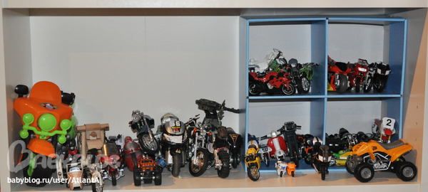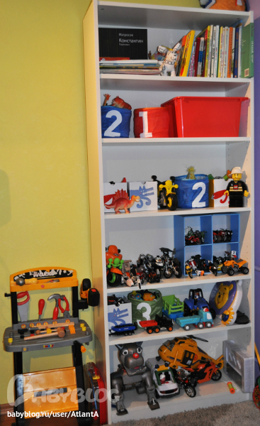 итак, попадая в комнату, мы видим игровую зону. на полу волосатый ковер из Оби. белый стеллаж (икея) приобретен совсем недавно, поэтому я еще не всё продумала)) особенно то, что касается нашей коллекции мотоциклов.. коробочки и корзиночки тоже из икеи. в них всё тематически разложено. машинки к машинкам, зверюшки к зверюшкам!))