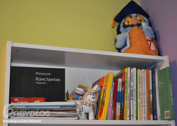 небольшая верхняя полка для книг и материалов для творчества. книги я прячу подальше, иначе если у Кости они будут в доступе, то читать я буду целый день)))))