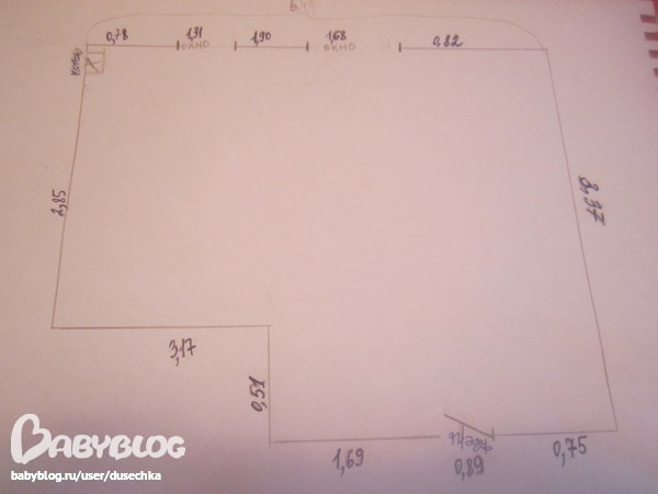 Кухонный гарнитур будет распологаться по стене 3,17на 2,85,стенка стоит по противоположной стене,где-3,37,диван будет с левым углом, и будет стоять как бы в углу возле в ходной двери...Возле кухонного окна планируется небольшая обеденная группа.