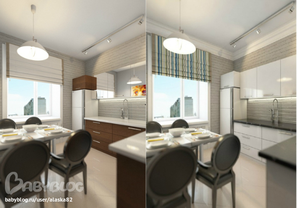 На визах не совсем правдоподобная ситуация (кирпич на стене - не хочу, было уже у нас, люстра, шторы, картинки... но это детали..... шкафа над холодильником вообще не будет, либо сделаем встраиваемый холодильник)