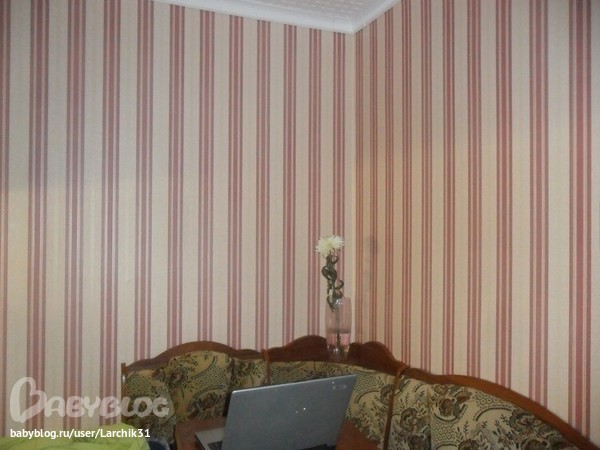 А имеем мы полосатую кухню( Полосатая она случайно получилась. Немецкй винил на флизилине вонял дохлятиной, не знала что делать. Пожоже что дело было в стене, что то там задыхалось. Пришлось их оторвать и 5т.р ушло в помойку. Решено было для эксперемента поклеить самые-самые-самые дешёвые обои. Выбрались бумажные, Гомельские за 75руб рулон)))) Кстати лепились отлично, мазала сразу по 4 полоски, обои не расползались и после высыхания ничего не поняло...ненавижу эти полосочки, но переклеивать в третий раз обои я не могу не марально ни физически) Подруги успокоили, говорят вроде так и ничего ))))) Я про себя добавляла- ничего хорошего..В общем так моя кухня стала полосатая))) Теперь я собралась повесить картинки, но тематика меня загнала в угол. Понятия не имею что вообще сюда может пойти. Вот фото этого шедевра..