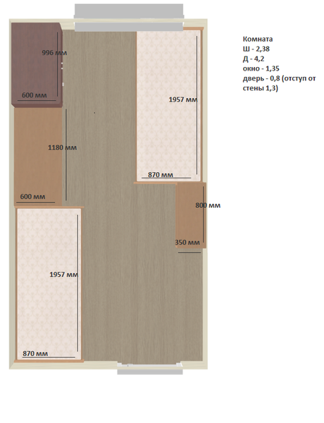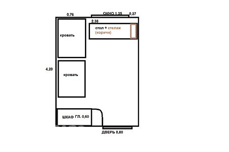 Я бы сделала почти, как у вас. Только шкаф уже нужен (45 см). Попробовала с вашими размерами разместить 2 кровати и шкаф, получается к шкафу не подойти. Я бы поставила угловой стол, в угол стола компьютер, по краям рабочее место. Стулья можно установить на колесиках))) У нас похожая комната с сестрой была. Еще можно одну кровать поставить вдоль окна. Фотки опять не грузятся сюда, поэтому выложила 2 плана по ссылкам: