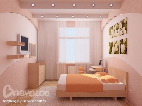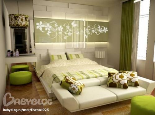 Комната маленькая-мебели минимум! Кровать, телевизор, торшер (либо 2 бра) или вообще на прищепках к изголовью кровати крепятся светильники. Зеленый думаю не надо...шоколадный, кофе с молоком, серый. Тюль-белоснежную, шторы- можно с легким рисунком или однотонные. Над кроватью 1-2 картинки (смотреть на шторы, покрывало) Ну и подушки-много)))) Шторы можно менять)))Летом, почти до терракотовых. Зимой холодные, бледно-серые, либо бежевые) Хотя...если будут оранжевые шторы можно попробывать зеленые подушки))) Хотела вставить фотки...сайт глючит((((
