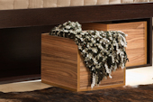 Интерьерное решение спальниимеем кровать. в кровати ниша. в ней 2 куба.