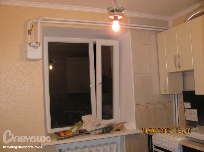 Купили малюсенькую хрущевку. Пытаемся делать ремонт сразу во всей квартире. Помогите с выбором светильника и оформлением окна на кухне. Вот, что имеем. Кухню одним планом снять не получаеться, маленькая очень! По стене, там где сверху розетки будет холодильник, белый.
