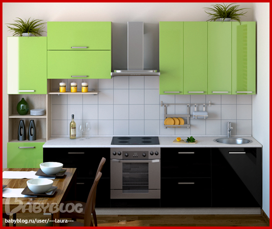 Интерьерное решение кухниНачну с того что нормальной кухни у меня никогда не было (если не считать отдельно стоящий холодильник ,плита и мойка с рядом стоящим шкафчиком)Так вот эти шкафчики светлые.Поэтому новую кухню хочу в каких нибудь ярких цветах.Девочки ,спасибо Вам большое ,что выставляете фото своих кухонь!!!!!!!Я перечитала все сообщество!!!!!Я так поняла что сейчас очень модно выбирать глянцевые кухни в основном белого или в сочетании венге с бежевым. Бюджет был скромненький и кухня без техники вышла у нас в 55 тысяч .(кухня не большая) Так вот девочки обладательницы кухонь фасадов ШОКОЛАДНОГО с САЛАТОВЫМ (или фисташковым)(((у меня цветовой кретинизм))) КАК вам ваши кухни???????Я перекопала весь интернет не могу найти то что нарисовал нам мастер ну примерно вот так только низ" шоколадный"