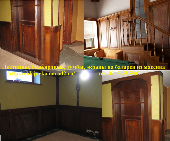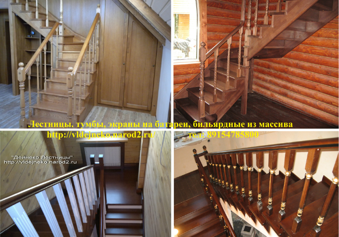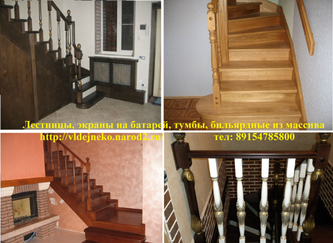 Изготовлю и смонтирую лестницу из массива твердых пород дерева, любой покраски для вашего дома. Материал качественный заказывается в Краснодарском крае, опыт работы 8 лет на фирме. Фотографии моих работ можно посмотреть на сайте http://vldejneko.narod2.ru/ Звоните уточняйте по ценам. Так же предлагаю изготовление бильярдных комнат, винных комнат и стелажей, подоконников, экранов на батареи. Владимир 89154785800