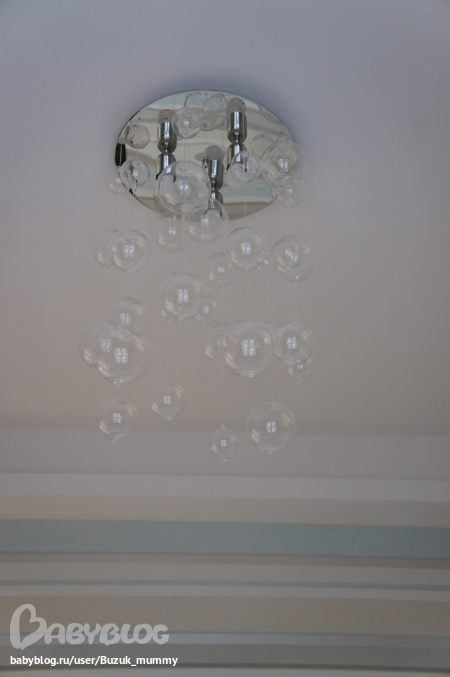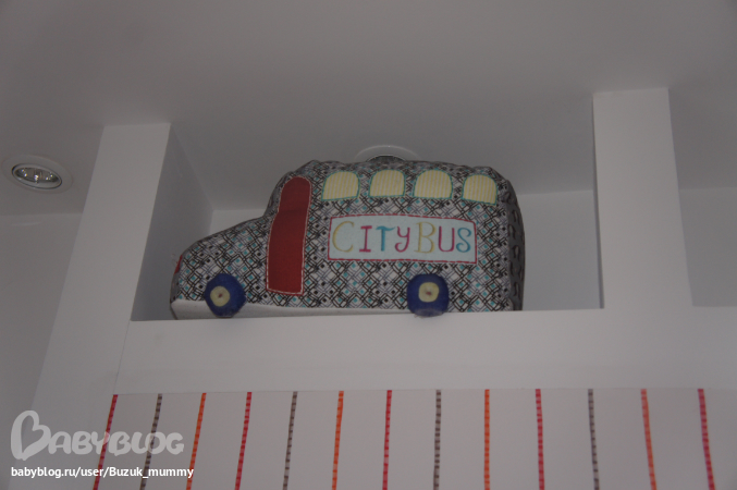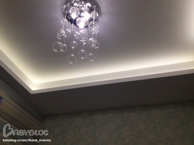 по потолку идет карниз, за который спрятана диодная лента - подсветка. Я долго не соглашалась, мне казалось, что это как-то безвкусно... согласилась только потому, что хотела заказывать тканевый потолок - чтобы от периметра к центру комнаты задрапировать тканью (съемной, чтоб стирать) и за тканью думала подсветка будет хорошо смотреться. Но когда увидели как классно смотрится - решили пока без ткани обойтись - очень нравится лежать на кровати и смотреть на полоток))))