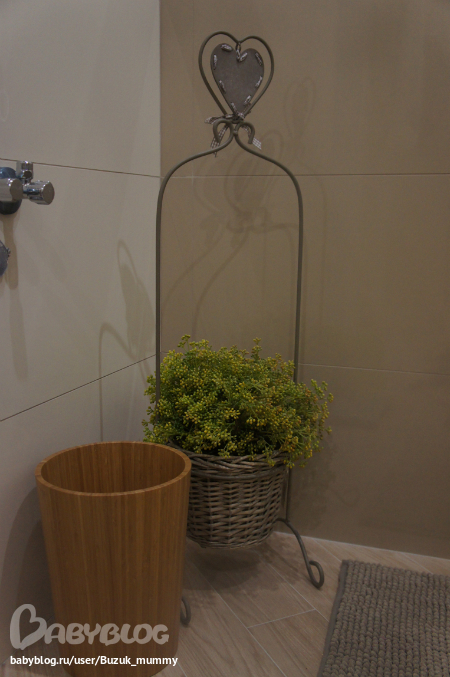 это кашпо с искусственным цветком тоже из "Твоего Дома", потом передвинется к душу, а здесь встанет мебель с еще одной раковиной. Пока ванная еще тоже не закончена - ждем прихода всего)))