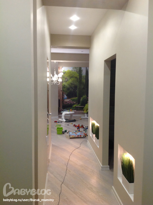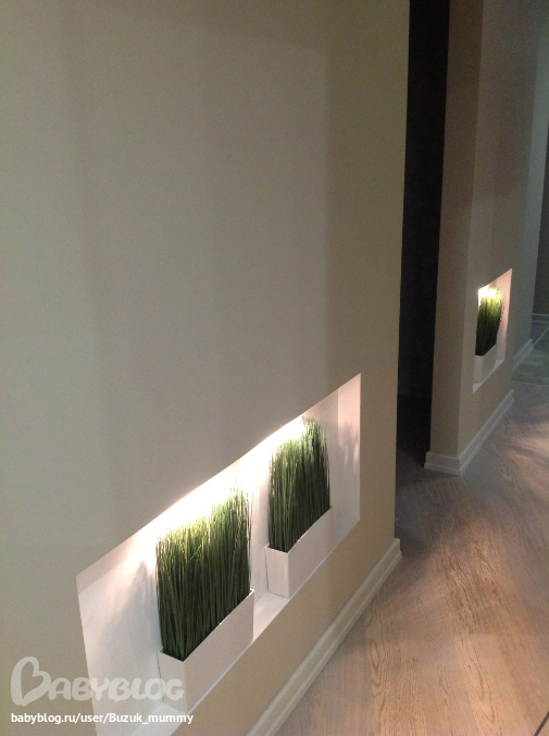 В стенке прорубили ниши - чтобы коридор был "посвежее" - уж больно блинным казался и стал уже, за счет увеличения ванной. Подсветка смотрится улетно, фото этого так не передает, трава бросает тень на пол, если выключить основной свет - бомба :)