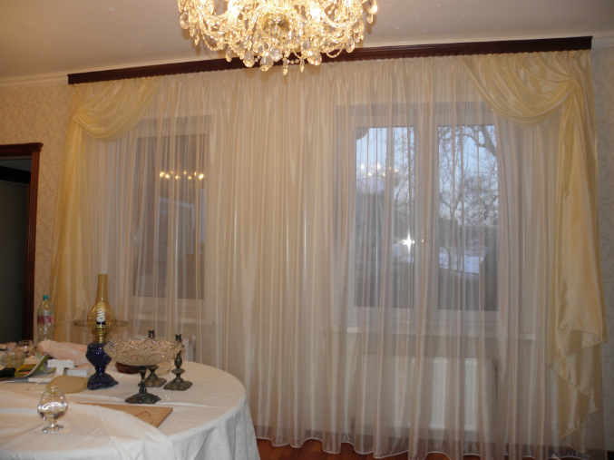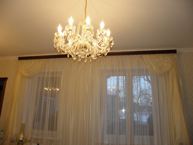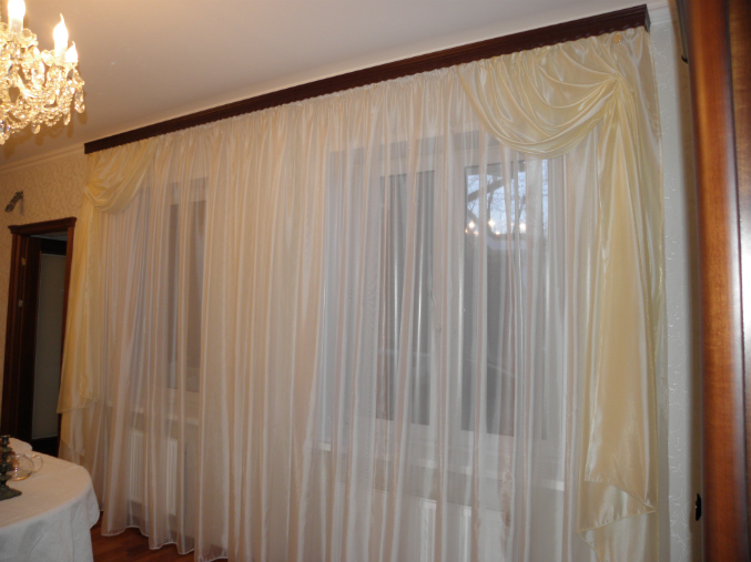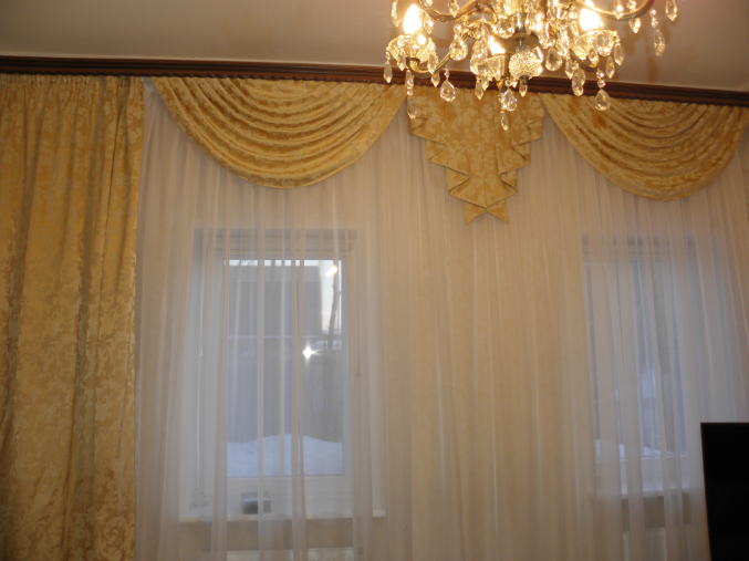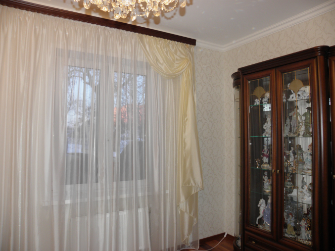 Темный карниз очень  портит все . Даже не хочется смотреть дальше на сами шторы.куцевато смотрятся боковые шторы, нужно еще добавить ткани с драпировкой.