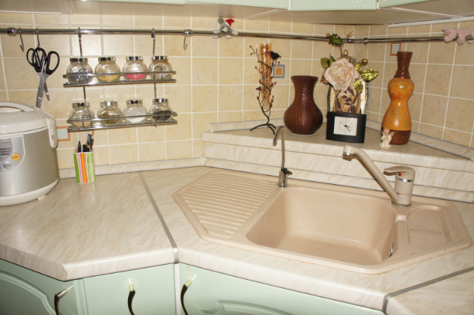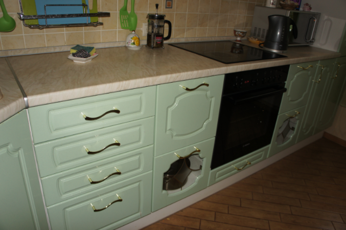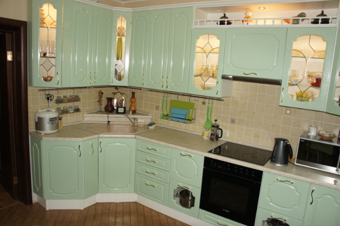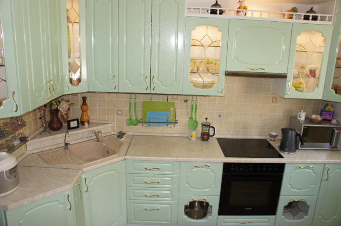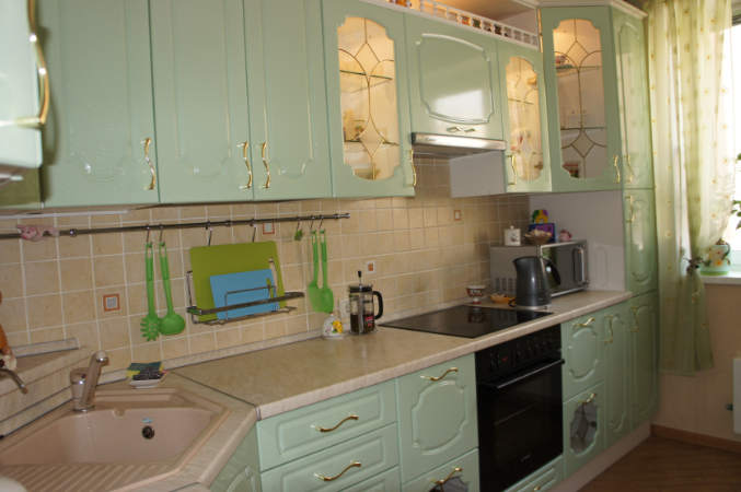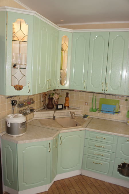 Гарнитур этот я нигде не искала. и не выбирала. Наткнулась на него случайно, когда еще не задумывались о приобретении. А когда пришло время заказывать кухню, просто поехали в то место, где я встертила эту, и заказали, и нисколько не жалею. В уходе она неприхотливая. Цвет получился фисташка+глянец с золотистым напылением (фотки напыления не отобразили, к сожалению, в реале она немного переливается). Цвет от вспышки получился светлее, чем на самом деле.