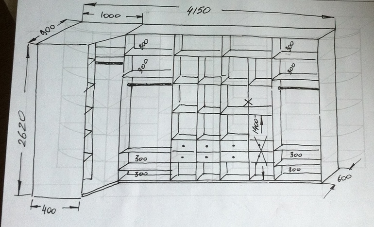 Вот наконец-то мы дошли и до шкафов. Приходил сегодня замерщик, сделал вот такой план. Там 2 шкафа - угловой и длинный шкаф купе во всю оставшуюся стену...Двери от углового шкафа идут так: зеркало -дерево-зеркало-зеркало-дерево. Цвет деревянных дверей я выбрала венге, а вот на зеркальных дверях хотелось бы пескоструйный рисунок...Но одно но: его же на две двери не нанесешь, некрасиво будет? надо же на все три? Или и на 2-ух красиво будет смотреться, если в угловом шкафу просто чистое зеркало оставить?