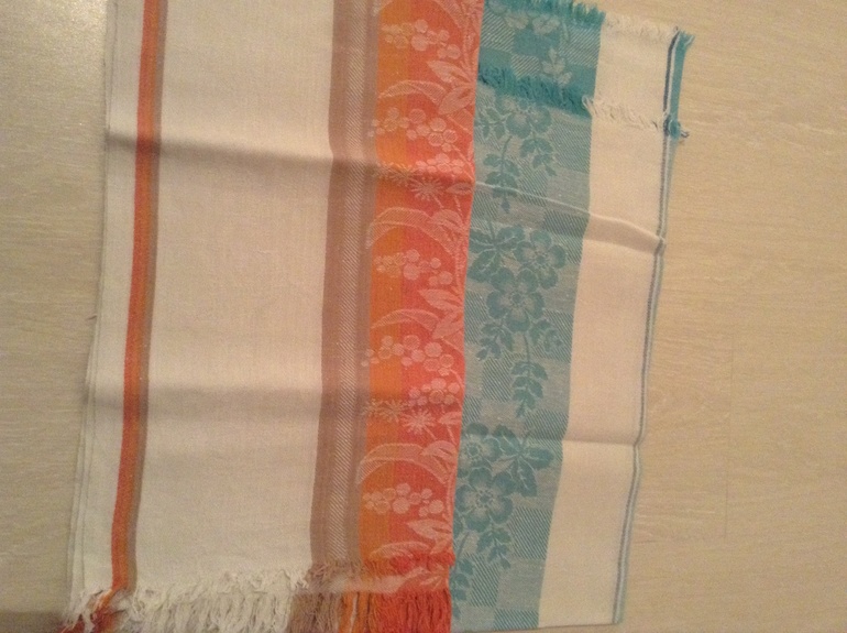 Остальное бабуля грозилась отдать, когда будет у нас своё жильё. И вот близится день переезда и я наконец раскулачила эту барыню))))))) Она мне показывала отрезы полотенец, которые были куплены её тётками ещё в послевоенные времена, в 50-х годах где-то. Тогда полотенца не резалось, а были длиннющие и их резали и подшивали как надо хозяйке. Сначала она обещала отдать всё, но когда дошло до дела опять поделила пополам и часть оставила себе. Но я рада как слон, пусть это древняя древность, но как же они мне нравятся. Особенно бежевое, которое бабули не приглянулось и она отдала его целиком.