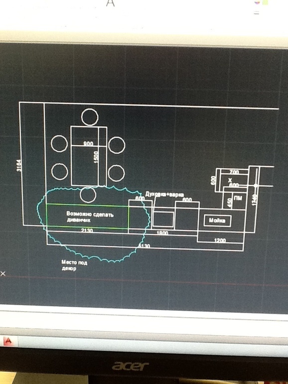 Ну смотри от двери тумба с стиралкой, далее по 5м стене тумба 1200мм в ней мойка( мне честно не нравится угловая, я себе сделала прямую, далее ПМ или шкаф 45-60см, далее шкаф 60 с духовкой и варкой,далее шкаф 60 и колона с холодильником,итого 3мОстается два метра можно поставить диван или сделать подиум для сиденияЩа, кинь точные размеры, ща в автокада начеркаю