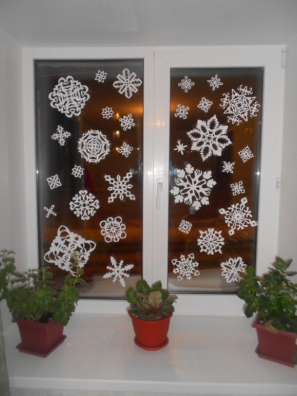 на скотч , это просто из бумаги я сама вырезала, окно не нужно отмывать, достаточно просто маленького кусочка чтоб приклеить узор
