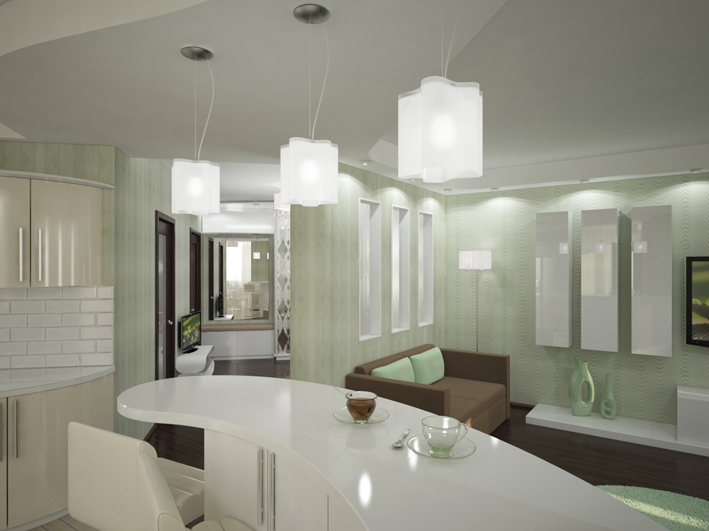 2. Цветовое решение- светлая, воздушная мята+ шоколад (диваны, что б не пачкались)+карамель ( кухонная мебель) таким образом получилось сделать просторную квартиру и избежать эффекта общежития.