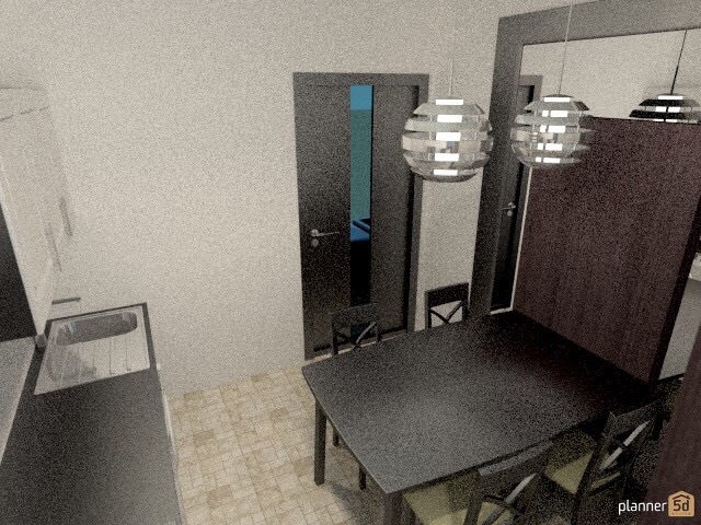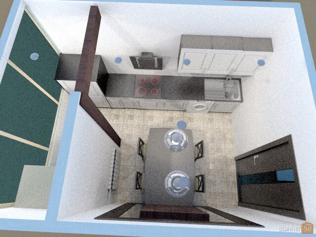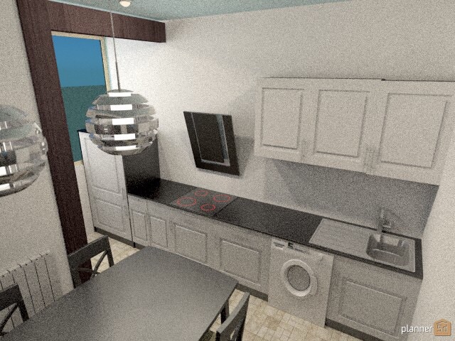 вот так виртуально выглядит наша кухня, но не скажу, что это то, что мне хочется. Это то, что получилось, учитывая объекты, от которых нельзя избавиться: стиральная машинка, детский шезлонг (куб слева у стены), холодильник.