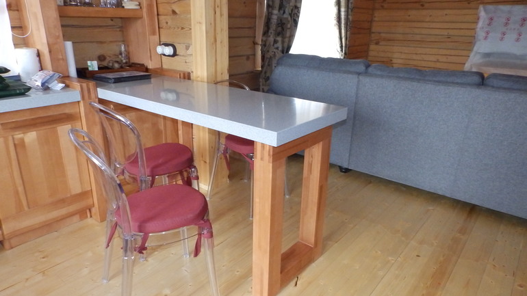 дом меня удивил сразу. он одноэтажный, как бы распластанный, по периметру дома идет открытая площадка, шириной около 2-х метров, отделаная декоративной половой доской. площадка под общей с домом крышей. есть два выхода - из кухни и парадный. открываешь парадную дверь и