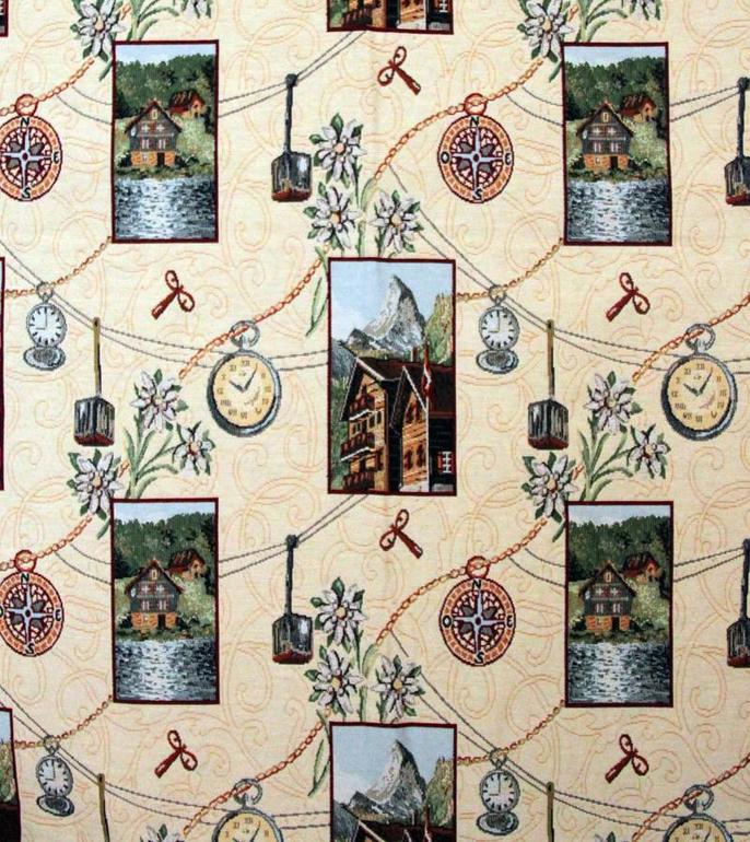 ткань для римки с, практически, национальными узорами-эдельвейсы, альпийские домики, часики и горы.