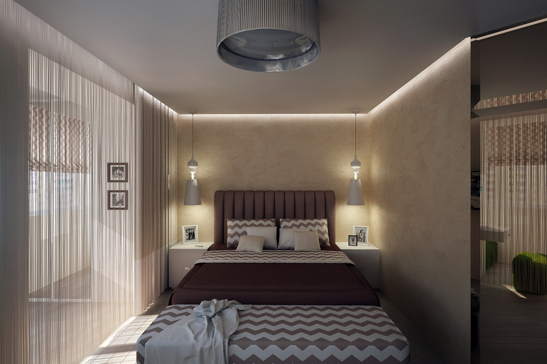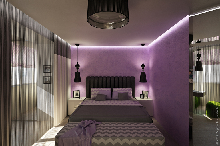 фиолетовый цвет-цвет одиночества- не стала бы в супружеской спальне такой цвет делать. В супружеской комнате лучше зеленые тона по-феншую :)