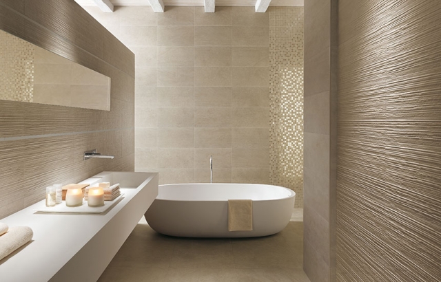Думаю, что в эксплуатации будет хорошо, если сделать правильную раскладку. Не пускайте рельефную плитку в зоне ванны, выделите ей другие участки, тогда и эффектно и практично получится.