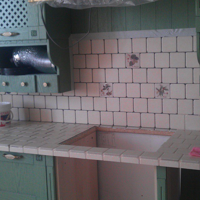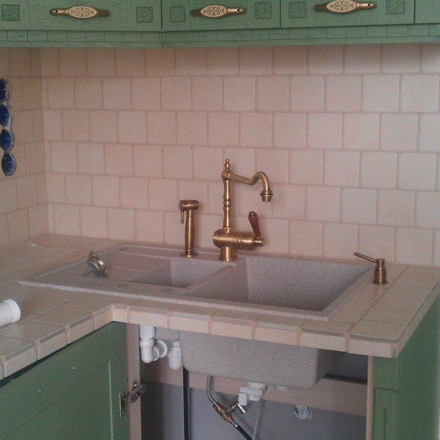 Ну и мечту исполнила - столешница из плитки. Затирка эпоксидная. И смеситель с душем.