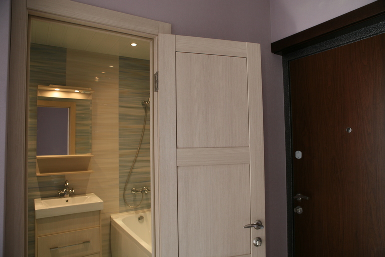 Двери во всех трех комнатах - «Порто Прима». В главную комнату - дверь-купе, в остальные помещения- простые.