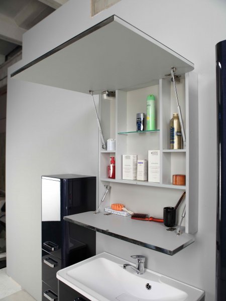 Интерьерное решение ванной комнатыНачинаю заранее присматривать. Запала на такой. Но он необычный. Как вы думаете, удобно? Вживую трогала. Он с газлифтом. Буквально рукой и вверх дверца отъезжает. Мне полка понравилась нижняя откидная. Но что-то смущает. Например, если полка откинута и нужно умыться, маску смыть и тп то головой будешь биться и надо все барахло убирать с нее и закрывать. Или лучше с тройным зеркалом подискивать, типа трельяжа. Направьте меня в нужное русло.