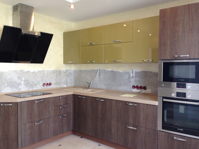 А можете показать как в итоге выложили фартук. У меня почти также спланирована кухня, ломаю голову как на стене без верхних ящиков выложить фартук