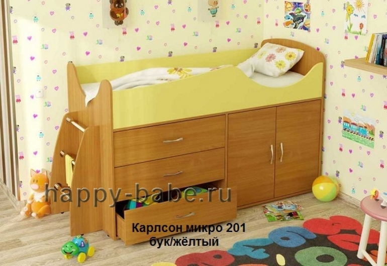 Но у нас на месте ступенек выдвижной стол и под столиком еще 2 полочки для книжек. А за столиком большой ящик, где она складывает всякие ненужные вещи, которые ей выбросить жаль. Левый шкафчик у нас очень большой. У меня туда дочка может спокойно залезть.А ступеньки-ящики стоят сбоку от кровати. Мы сразу покупали ей кровать с большим матрасом. А для маленьких комнат такие кроватки идеальный вариант. У дочки комната 9 метров.