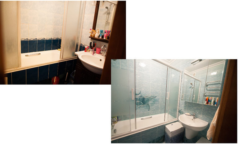 Тоже почти не меняли ничего, кроме раковины, полотенцесушителя и экрана. А стало просторнее.