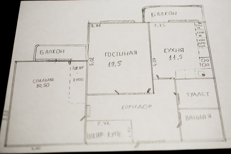 Мы решили застеклить заново оба балкона (хорошо застеклить), сделать большой балкон частью квартиры (там сделать теплые полы), снести все ненесущие стены, превратив бывшую гостиную в комнату для сына и гостиную-холл. Комнату для дочки мы решили сделать из бывшей спальни, снеся там шкаф-купе и отделив часть комнаты под гардеробную.