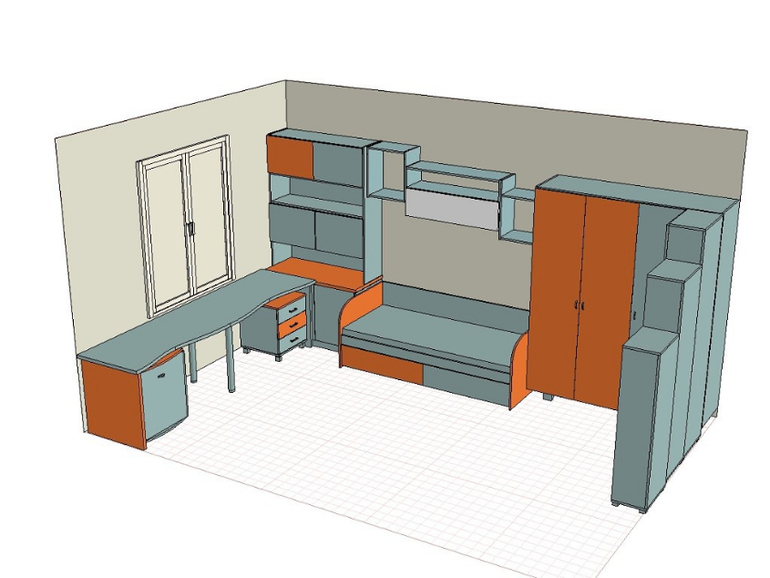 Елена, а может вам рассмотреть вариант, покупки только кровати, а все остальное докупить другого производителя?По поводу варианта, на вашем рисунке:-- комната очень перегружена мебелью-- Нижний ярус у стеллажа (у окна) получается не функциональным-- Ну и я, как и все) против чего-либо над кроватью, тем более полки.