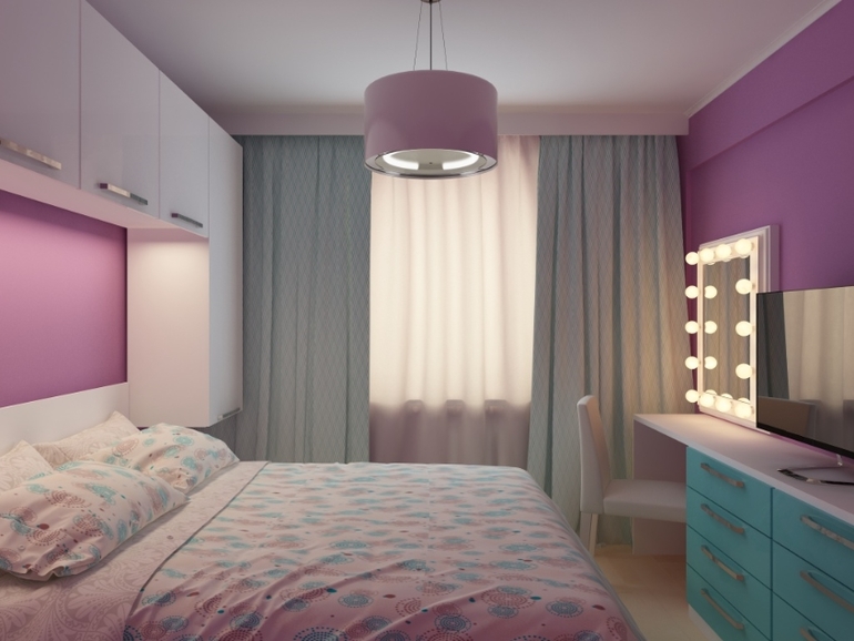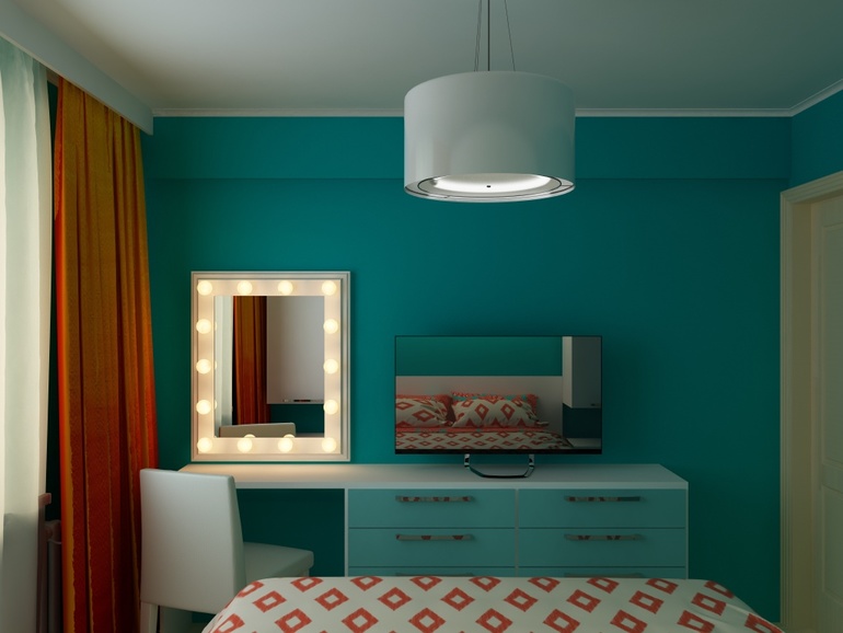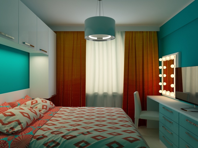У нас расстановка один в один. Шкафы над кроватью висят да.Вот почитала про эту массовую фобию и самой стало страшно)) (Я увидела, что вы отказались от верхних шкафов)Меня только смущает зеркало, в котором отражается кровать.. Сама не смогла пока придумать как с зеркалом быть (туалетный столик же, должно быть зеркало по идее), поэтому у нас вместо него временно стоит детская кроватка)). У нас бело/бирюзово/коричневая гамма, думаю добавить фисташковые или горчичные акценты.Ваша бирюза+оранжевый понравилась, смело. Вот только шторы просятся поспокойнее, неоранж. ...