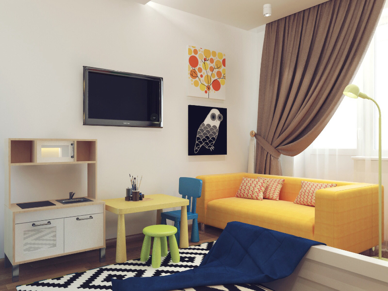 За желтым диваном дверь на балкон? Откроется?Спиной к окну, мне кажется, не очень удачное расположение дивана. И ТВ смотреть от шкафа получается? Детям вредно ТВ под углом смотреть для зрения