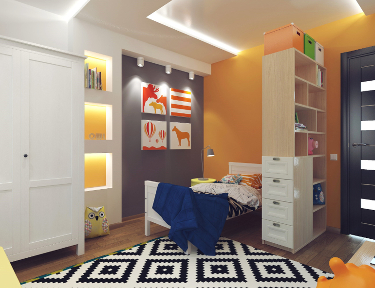 Очень красиво получается!Только вот не понимаю зачем она ставит не существующие вещи?! ведь потом вы будете их искать!В детской пластикового стола такой формы такого цвета нет, стул голубой а не синий, а табуретки такого цвета нет.Шкаф на последней картинке это Пакс и Труфаст соединенные, что бы получить то что на картинке надо будет резать двери.И мне кажется вот эта перегородка на входе лишняя, ребенок в комнате один, не нужна она. может лучше придвинуть кровать к стене и поставить в изголовье вот такую штуку