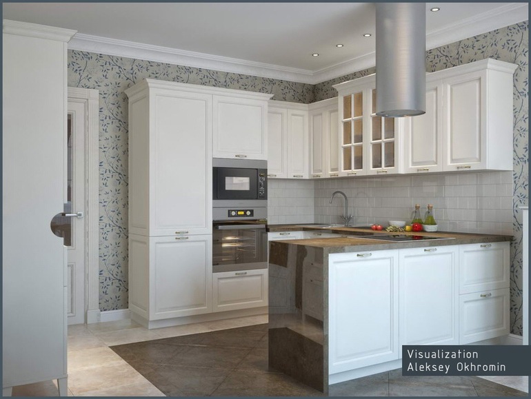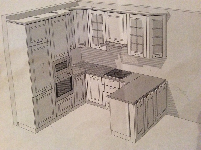 Вот проект кухни( меня смущает-то что раковина рядом со стеной), кухня будет белая с серой патиной- очень хочется мозаику на фартук из перламутра и ручки из перламутра,а столешницу из натурального камня.в голове не представить хорошо ли будет сочетаться-жду ваших советов. Не слишком ли светлая столешница для белой кухни?