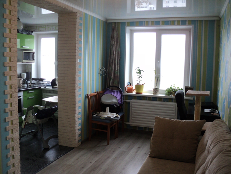 Шторы можно подобрать желтобежевого цвета с чередованием пастельно розового ( сильно разбавленная фуксия). Мягкие подушки на диван в пастельных голубых , бежевых и желтых оттенках. Над диваном золотые матовые светильники или зеркало, ковер с мягким пушистом ворсом желтобежевого оттенка или в цвет пола Жаль фотку с телефона не могу поставить, так было бы нагляднее. Это поможет объединить пол и стены, которые живут разными жизнями.
