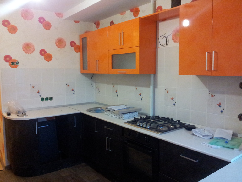 Красивая кухня, оранжевый люблю, однако, не хватает чего-то, ещё одного цвета, белый — не то( нужен или фиолетовый или зелёный. Например, положить фиолетовые салфетки, они дополнят цветовую гамму. У нас, наоборот, мебель с фиолетовыми вставками, а на столе такие оранжевые салфетки, многофункциональные.