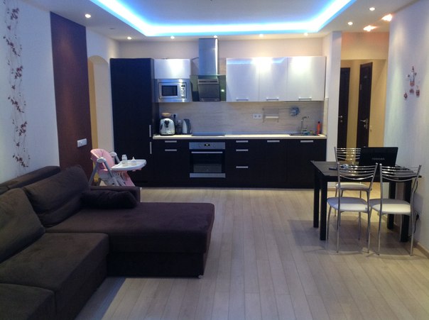 У Вас очень просторно и со вкусом сделано,вы сами все планировали?Мой муж в восторге как все гармонично у вас!Тоже думаем объединить коридор и большую комнату сделав кухней гостинной,но мне кажется у нас площадь намного меньше вашей,хотя муж говорит в бетоне так всегда кажется