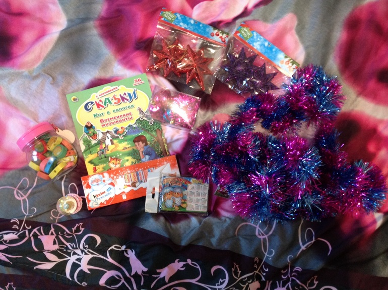 Сегодня мы получили нашу долгожданную посылочку. Сфотографировать нормально даже не успела, дочка сразу все растощила. Нам все очень понравилось и сразу появилось новогоднее настроение. Спасибо за праздник