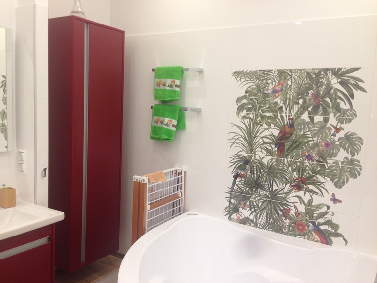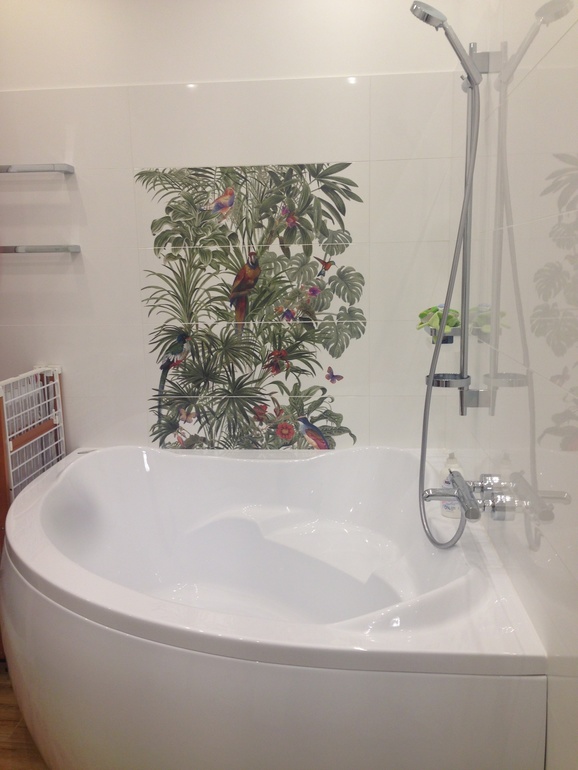 Интерьерное решение ванной комнатыКакое счатье иметь два санузла!))Этот су для девчонок.Увидела на выставке плитку с попугаями и так запала она мне в душу!!!Ждала,когда коллекция появится в Москве и отталкиваясь от попугаев делала весь интерьер ванной.