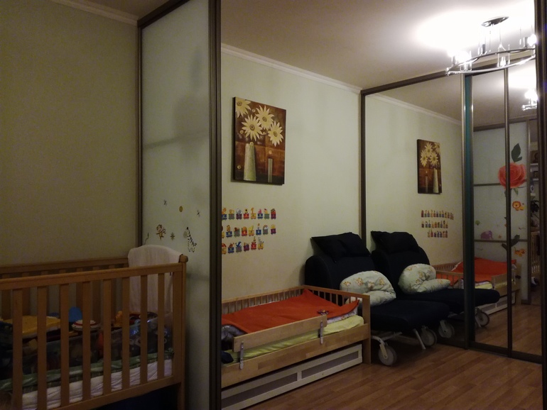 Вот так выглядит комната в данный момент. На кухне один угол занимает кухонный уголок и круглый стол, другой угол полностью занимает собака. Кухонный гарнитур выстроен в одну стену. Куда то надо еще поставить кроватку для малышки, диван для бабушки. Двухярусные кровати не рассматриваем так как младший оооооочень активный мальчик. В общем как то так, может очень сумбурно написала. Но это такой крик души.