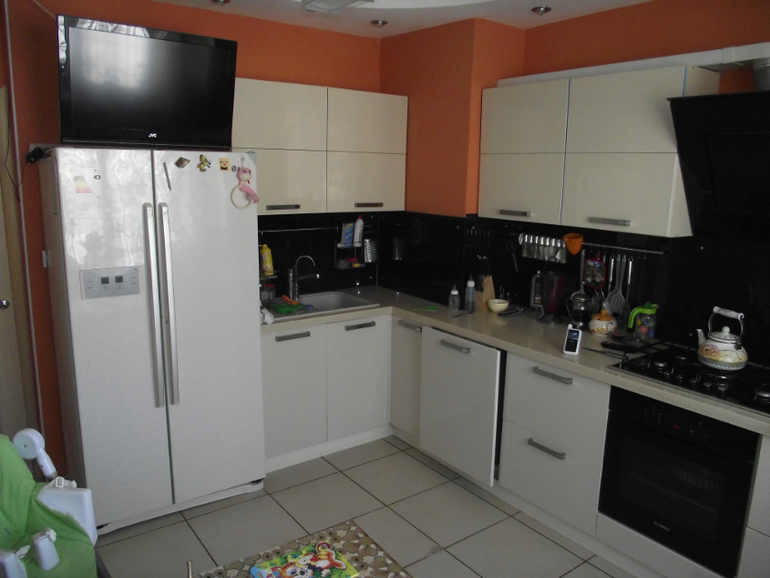 Интерьерное решение кухниФото под катом. У нас кухня перекрашена. Изначально муж самостоятельно купил обои,совсем неподходящие под кухню,я решила перекрасить в бежевый цвет, и кухня вообще потерялась. Потом я решила сделать 2 стены оранжевого цвета,где сама кухня, остальные 2 стены оставить бежевыми. Но меня уже угнетает этот оранжевый цвет стен...к тому же с сочетанием черного....Сторона не солнечная,хочется чего-то светлого,чтобы сочетался и с кух.уголком. Подскажите в какой цвет перекрасить кухню!!!!!???? Всё,что советовали на других сайтах вообще не подойдет,многие говорили бежевый,Карамельный,зеленый,но это не то....я даже делала в фотошопе стены зеленого и голубого цвета,полная ерунда. Может попробовать тон персика и кораллового?? нежные,приближенные к белому цвету.