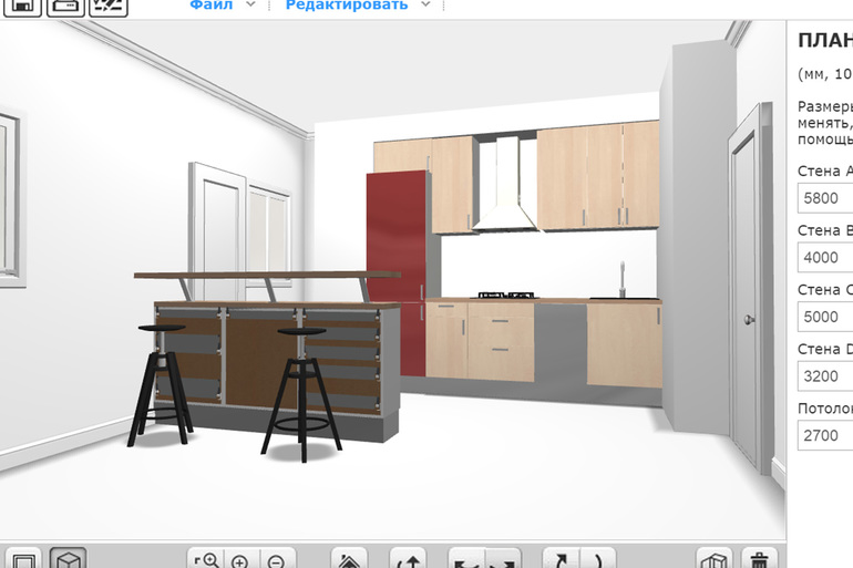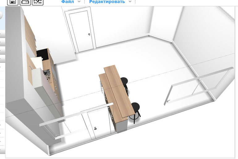 В 1 оставила часть стены, к ней холодильник и 3 шкафчика 60 см шириной, 40 см глубиной. Но смотрю на эту стену и не нравится она мне, хочу большое пространство.