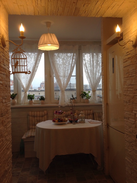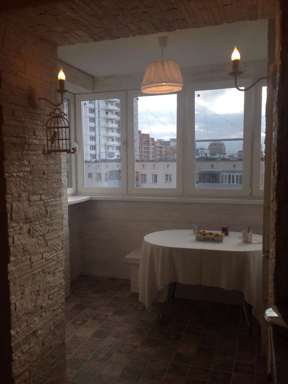Интерьерное решение лоджий, балконовточнее из балкона (5,6 кв метра) мы сделали обеденную зону. Сама кухня еще не сделана, она следущая по очереди) поэтому ее не показываю