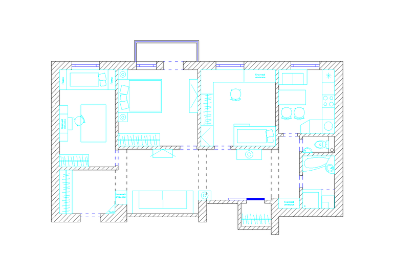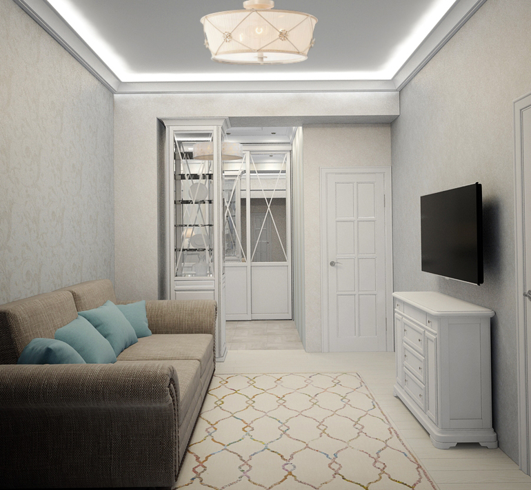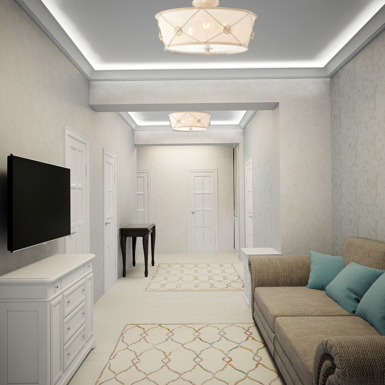 Заказчики поставили мне задачу, создать из коридора полноценную гостиную. Для этого решено было немного укоротить комнаты, расширив коридор. И переместить вход в одну из комнат.